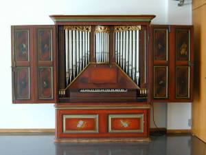 Tonumfang: C - f'''. Die Windversorgung mit einem 4 Faltigen Keilbalg ist original erhalten. Der Schöpfer mit 2 Falten wurde stillgelegt. Der Windruck beträgt 36mm Ws. Die Bemalung wurde ca 1950 rekonstruiert nach der noch erhaltenen Fassung an der Innenseite der Türen. Die heutige Tonhöhe beträgt 443 Hz bei 20°. Stimmung nach Neidhard III. Die Orgel war ursprünglich auf 415 Hz gestimmt.