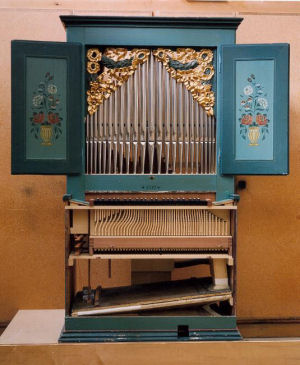 Die kleine Hausorgel wurde stark umgebaut und verändert. Es fehlten die originalen Schnitzereien über den Pfeifen. Die originale Windlade wurde leider ausgebaut und 1965 durch eine neue, nicht stilgerechte Lade ersetzt. Als 2'-Register dienten Pfeifen aus einer alten Kirchenorgel.
